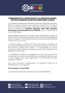 Mamadou Aliou Diallo membre du Conseil d’Administration de la CGE-GUI n’est pas arrêté selon Maria Diané la secrétaire générale du patronat guinéen dans un communiqué. L’homme d’affaires est à Dakar, il n’a aucun souci avec les autorités sénégalaises. ( Voir le communiqué ci-dessous )