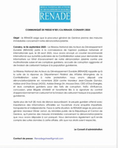 Le réseau national pour le développement durable (RENADE ) sort de sa réserve pour presser la justice dans l’affaire du carburant toxique.  Cela fait suite d’une missive envoyée aux autorités judiciaires de la confédération suisse contre Addax and Oryx group et Addax energy sa toutes des multinationales.